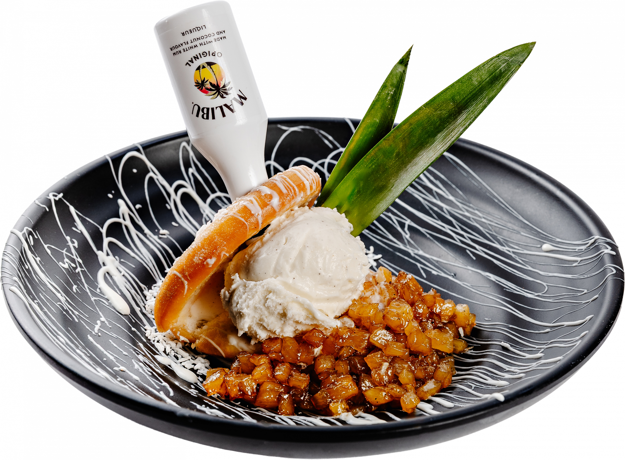 Fried bao bun + caramelised pineapple + desiccated coconut + homemade vanilla gelato + white chocolate drizzle + miniature 50ml Ma... Read more